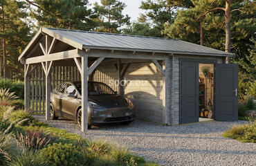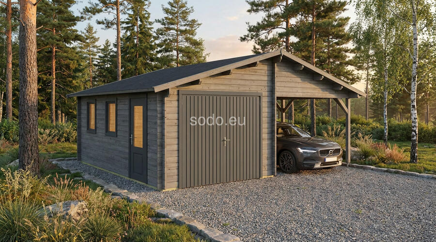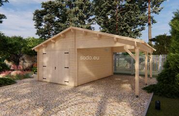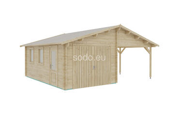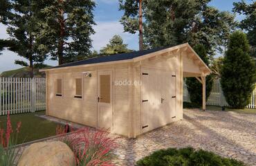 Split between enclosed and open shelter, this model includes a 17.2 m² garage and matching 17.2 m² carport under a gable roof reaching 3.17 m. Built with 44 mm walls, it’s a practical solution for storing one vehicle indoors while keeping another protected outside. Full truck - 8 pcs. Pack size - (930x6000x1200)